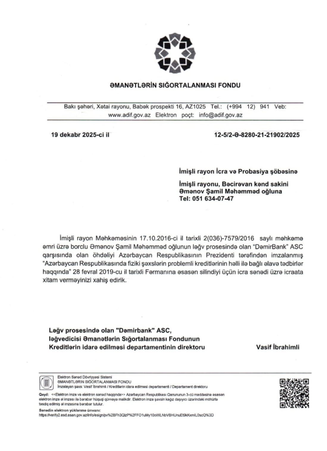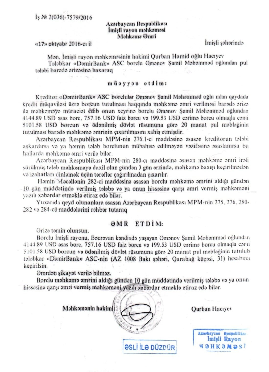 İcra məmuru vətəndaşa bildirib ki, 2016-cı ildə “Dəmirbank” ASC ona qarşı borcun tutulması tələbi ilə İmişli rayon məhkəməsinə müraciət edib, məhkəmə əmri ilə bu tələb təmin olunub. Və qəbul edilmiş qərarın icrasıyla bağlı icraat hələ də davam edir...